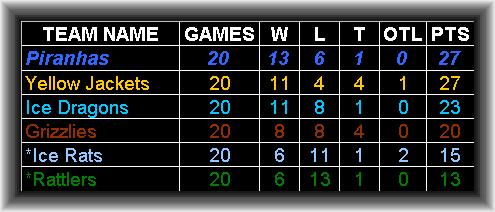 Standings as of March 15th, 1999 WE MADE FIRST PLACE! WAY TO GO GUYS! Best of Luck in Toronto! *=Can not make play-offs Tie Breaker for 1st place has been decided by most wins **A Special THANX to Larry from the Ice Dragons on keeping up on the Standings for us!!**